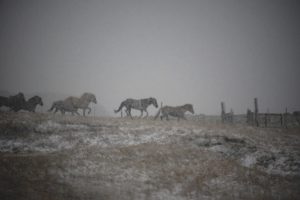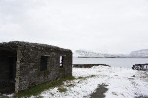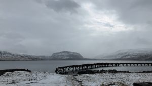 Stopped to get some shots of horses with big black clouds in the background. The horses came to visit me. More photos. Back in the car and away we go through the snow storm. We stopped at what looked like an abandoned fish place. There were a couple of partial cement buildings and a broken wharf.