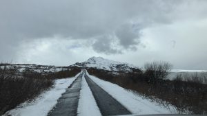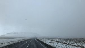 We were on the road early today, about 8:30. The road was good for a while, then the snow hit – a blizzard, couldn’t see very far, but the roads seem to be clear if snow, must melt fast.