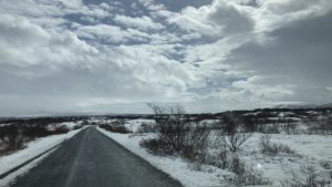 Back in the car and through more snow, looks wet and heavy. We drove for a while listening to the gps tell us where to go. We thought we were lost, the road was narrow and unmarked but we came out to the road we wanted.