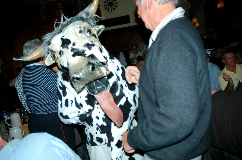 to do a dance, Paul and Barry get up and blow the alpin horn, and Sue gets up and yodels, and get to drink beer from a huge glass. More singing
